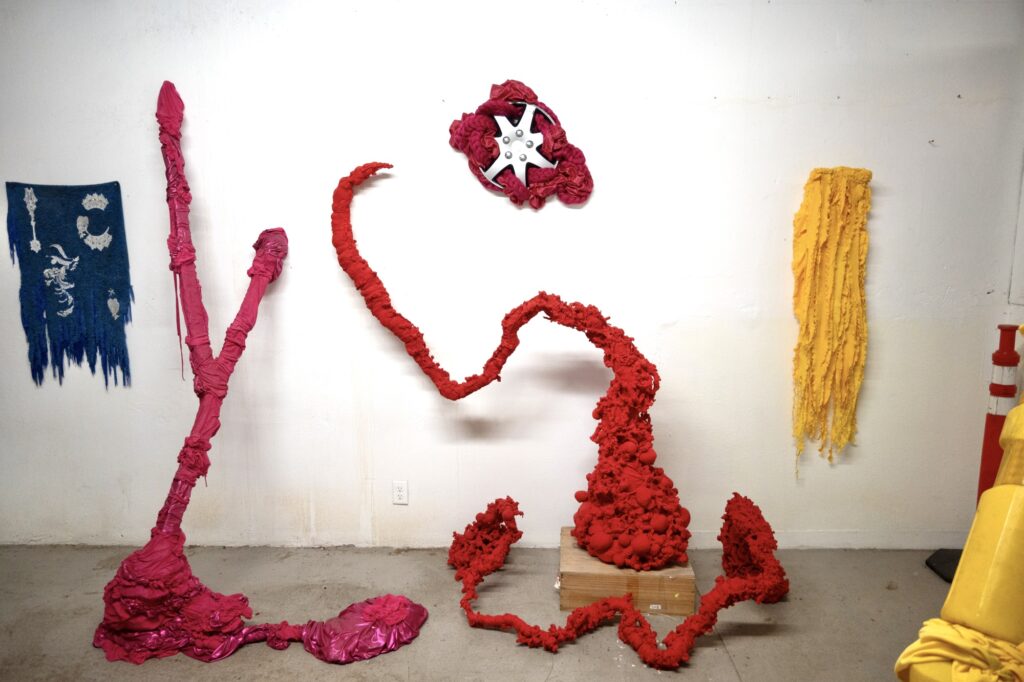 the ecstasy of undoing, 2019, foam, fabric, splintered wood, dimensions vary